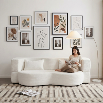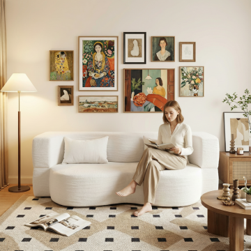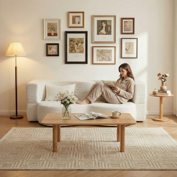 请根据图一产考图给图二生成一张场景图,画面丰富一点,可以把产品放在卧室靠墙放,画面可以丰富一点,也可以添加人物坐在沙发上看书,添加的人物需要是外国人 是个女性