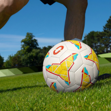 一张展现足球运动员动态瞬间的高质量摄影风格海报,画面中央是身着红色运动服的足球运动员正全力踢向足球的特写镜头,运动员姿态舒展充满力量感,足球上的黑白纹路清晰可见,绿色的足球场上草叶细节丰富。背景是夕阳西下时分的天空,橙黄色的阳光洒在整个场景上,形成温暖而富有戏剧性的光影效果,远处有模糊的其他球员和看台轮廓,天空中点缀着少量白色云朵。整体画面采用三分法构图,主体突出,色彩以红、绿、橙黄为主色调,光影对比强烈,高光和阴影细节丰富,营造出充满活力、激情四射的运动氛围,具有极强的视觉冲击力和信息传达效率,符合体育赛事宣传海报的设计感和目标受众审美。