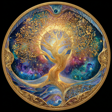 A vibrant, circular illustration, depicting a stylized Tree of Life, center frame, its golden branches and trunk forming intricate, swirling patterns, set against a swirling cosmos, the background filled with nebulae and celestial bodies, transition from deep blue to vibrant pinks, purples, greens, and yellows, (intricate details:1.3), (metallic gold accents:1.2), circular ornate border containing golden embellishments, (glowing effect:1.1), art nouveau style, dreamlike atmosphere, high detail digital art, illustration, concept art, cosmic elements, (shimmering stars:1.2), symmetrical composition, ethereal lighting, smooth gradients, 8k resolution.