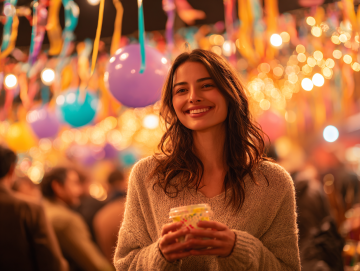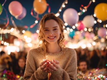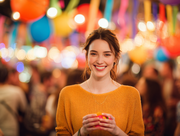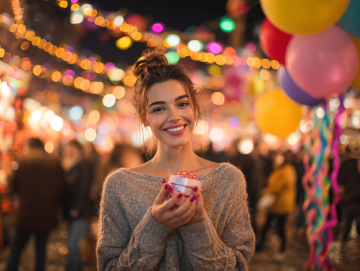 国潮风市集,毛发生长风装饰的自行车与梦幻粒子飘动,喜庆红灯笼与卡通虎纹围裙交织中式感,轻拟物风呈现节日欢乐氛围。