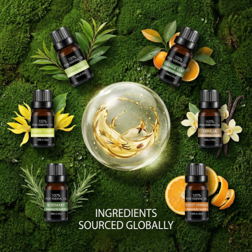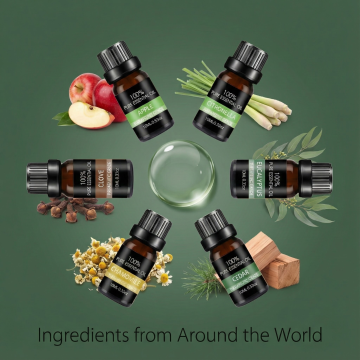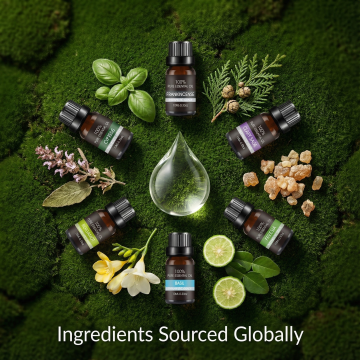 在晨曦微光穿透的松木森林中,透明磨砂玻璃材质的精油瓶身带有木质滴管盖,瓶身水珠晶莹剔透,瓶身标签印有月桂叶图案,放置在覆盖着晨露的蕨类植物丛中,周围散落着迷迭香枝叶与薰衣草花穗,精油瓶下方是湿润的青石,背景弥漫着薄雾,阳光透过树叶形成斑驳光影,水面倒映着精油瓶与植物的轮廓,整体呈现自然清新、宁静疗愈的氛围,画面色彩以森林绿、青石灰、晨雾白为主,光影柔和细腻,质感水润通透。
