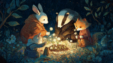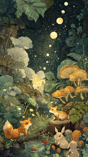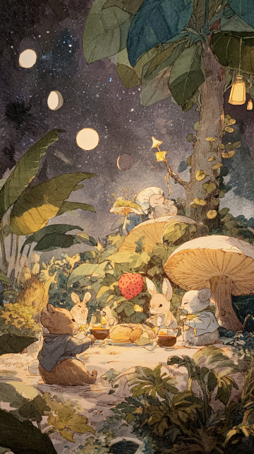 虫眼仰视视角,温暖绘本插画风格,融合碧翠克斯·波特(彼得兔作者)的自然细节与宫崎骏的奇幻氛围:夜晚魔法森林空地,小狐狸举办的“月相茶会” - 用露珠(新月)、半片珍珠母贝壳(上弦月)、圆蘑菇(满月)、被咬的草莓(下弦月)排列出月相序列,萤火虫提着微型灯笼照亮每个“月相”,猫头鹰老师站在树桩上指着星空,其他小动物(刺猬、松鼠、兔子)围坐倾听,每片叶子脉络、蘑菇菌褶、昆虫翅膀纹理、动物毛发都细腻可爱,月光透过树叶形成光斑,色调为暖褐、萤光黄、森林绿、夜紫罗兰,童话光影,细节丰富如自然图鉴,8K