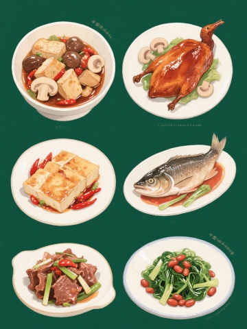 一组规整排布的美食系列素材集合,采用现代简约扁平风格,纯色背景(例如米白色、浅灰色或淡蓝色),画面整体色彩明快鲜亮,以高饱和度的橙色、红色、黄色等暖色调为主,搭配少量绿色作为点缀。包含多种中式美食元素,如不同种类的菜肴(肉类、海鲜、蔬菜)、汤品、点心、酱料等,每种美食都以简洁的线条和几何色块勾勒,造型概括而不失特征,各元素之间留有适当间距,排列整齐有序,形成清晰的视觉层次,整体给人清新、活泼、现代的感觉。