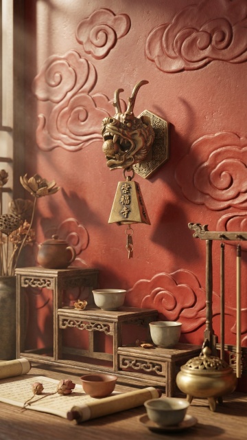 中式古典建筑在雪中静谧矗立,鎏金浮雕与3D撕纸风融合,光影梦幻,尽显神圣庄严。