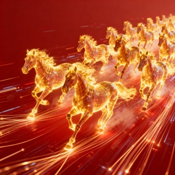 生成万马奔腾背景,力量,半透明红色背景、科技感带有光纤线速,马发金色光芒适合做ppt背景