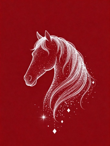 梦幻感与唯美感交织,白描线条勾勒骏马轮廓,粒子风点缀星芒,浮雕质感跃然纸上,插画风呈现优雅意境,暗红底色衬托节日祥瑞之气。