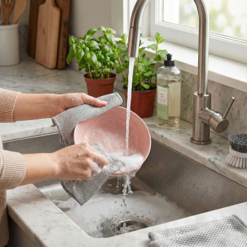 现代简约风格厨房场景,不锈钢材质的银色水龙头安装在白色石英石台面上的嵌入式水槽边缘,水龙头线条流畅、设计简洁,带有弯曲的出水嘴和旋钮式开关,表面光滑且有金属反光质感。台面干净整洁,左侧窗台上摆放着一盆盛开的白色百合花,右侧窗台上放置着几个新鲜的青柠和柠檬,窗外透进明亮的自然光,光线柔和地洒在台面和水龙头上,形成淡淡的阴影和高光,整体氛围清新、明亮、整洁、温馨,具有现代家居的舒适感和简约美学。