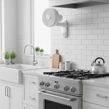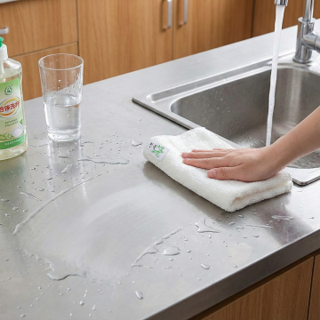 超写实3D渲染的现代厨房水龙头特写,极简主义设计风格,银色金属质感水龙头搭配可旋转出水口,安装在白色光滑人造石台面上,嵌入式不锈钢水槽带有圆形排水口,下方为深灰色哑光橱柜配银色长条形拉手,背景是浅色木质地板,柔和自然光从上方照射形成细腻高光与阴影,整体呈现干净、高级、宁静的氛围,注重材质纹理细节与空间层次感,不同角度展示水龙头在现代厨房环境中的多种布局搭配。
