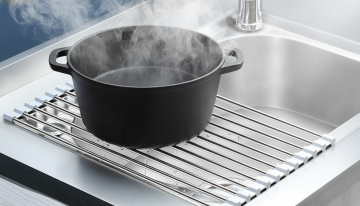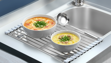 以图中的不锈钢沥水架元素,可以放洗好的餐具,也可以做隔热的放些热锅热汤,物体主体特征不变,设计4张跟不锈钢沥水架有关的图,比例 16:9