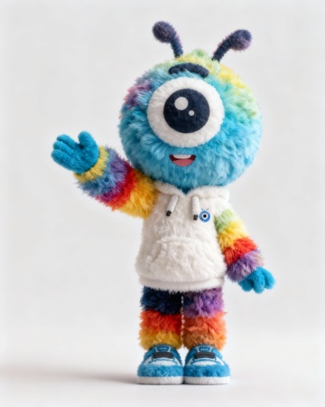 角色整体呈现出全毛绒质感的风格,毛绒有层次感,毛绒颜色为彩虹色调。角色保留原始形状,各个部分都如同被几种颜色柔软的毛绒材质精心包裹