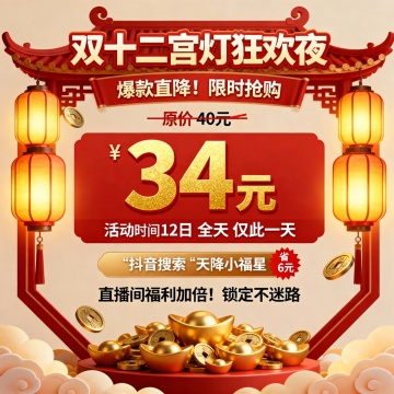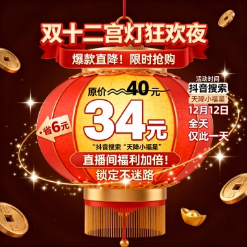 1. 基本信息: · 设计用途: 电商促销海报 / 社交媒体宣传图 · 尺寸: 1080px × 1080px (正方形,适用于朋友圈、社群、商品详情页等) · 主题: 双十二宫灯主题促销 2. 核心文案(请按重要性层级排列): · 主标题/最大卖点: 双十二宫灯狂欢夜 · 副标题/促销力度: 爆款直降!限时抢购 · 价格信息(必须突出): · 原价: ~~40元~~ · 促销价: 34元 (请使用醒目、更大的字体和颜色) · 活动时间: 12月12日 全天(可加上“仅此一天”) · 直播引导(关键行动点): · 直播间: 抖音搜索“天降小福星” · 行动号召: 直播间福利加倍!锁定不迷路 3. 视觉风格与元素要求: · 整体色调: 以红色、金色、暖黄色为主,营造喜庆、热闹、传统的“灯会”和“双十二”购物节氛围。 · 核心图形: 中国传统宫灯元素。可以将宫灯作为主视觉、边框装饰或背景纹理。 · 氛围元素: 可添加祥云、铜钱、元宝、折扣标签(如“省6元”、“爆款”)、闪烁星光等小元素,增强节日和促销感。 · 布局: 重点突出价格和直播信息,主次分明。4张