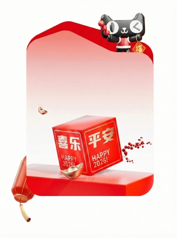 画面上方,一个福袋正倒出大量金币、金元宝,落入下方的购物车中,购物车里装满礼盒、金币、金元宝、优惠券,购物车侧面还挂着写有“超优惠”的红色标牌,中国红背景。上边飘彩带,边上还站着一们财神爷,笑脸面对我们,十分萌。