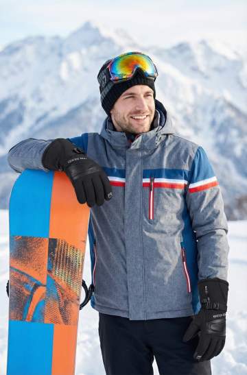 雪域实景中,3D风滑雪装备悬浮跃出收纳袋,重拟物设计融合现代科技感,蓝白配色彰显清爽时尚,虚拟现实般的动态构图尽显运动活力。