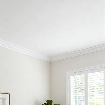 简约风格的室内局部场景图,整体以白色为主色调,呈现出干净明亮的氛围: 墙面是纯白色的护墙板 / 墙裙设计,搭配简洁的白色吊顶,边缘有精致的白色石膏线装饰,线条利落。 右侧是一扇黑色框架的多格窗户,窗外能看到绿色的树叶,自然光透过窗户让空间更通透。 画面下方能看到部分白色百合等绿植装饰,增添了生机,左下角还有少量深色家具(可能是橱柜)的边缘。
