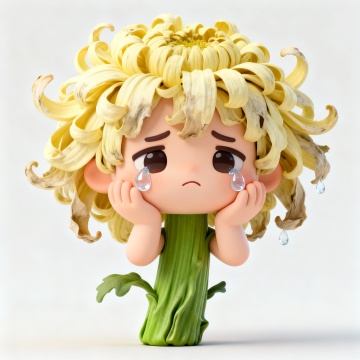 软3D风拟人菊花,萌趣卡通造型,花瓣发丝细腻卷曲,晶莹泪珠点缀,充满可爱感与情感表达。