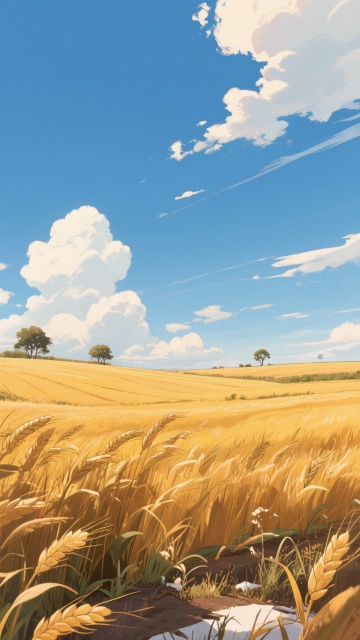 清新水彩风格的丰收主题海报,画面中广阔的金色麦穗田野占据下方60%空间,饱满的麦穗颗粒分明,麦芒清晰可见,随风微微摇曳,洋溢着丰收的喜悦氛围。天空占据上方40%作为留白区域,纯净的浅蓝色背景点缀着几缕柔和的白色云彩,营造出开阔透气的视觉效果。整体色调以温暖的金黄色和清新的蓝色为主,色彩过渡自然柔和,水彩特有的透明质感和细腻晕染效果贯穿画面,笔触轻盈灵动,画面简洁大方,能在短时间内传达出丰收的喜悦与自然的美好。