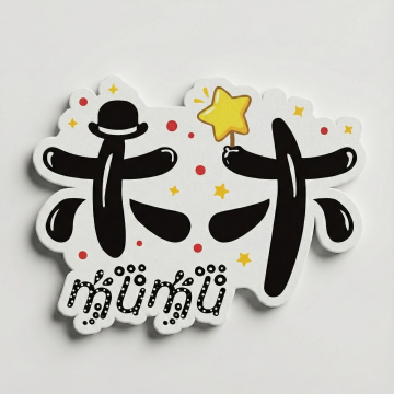 极简扁平风格卡通表情,白色纯色背景,大大的黑色圆形眼睛带白色高光,橙红色圆形小鼻头,脸颊两侧有对称的橙粉色圆形腮红,嘴角微微上扬形成俏皮的小弧度微笑,左右两侧各有一个黄色四角星形装饰,整体保持简洁明快的儿童插画风格,线条平滑无锯齿,色彩鲜明且边缘锐利,无阴影效果,呈现出可爱、愉悦、轻松的氛围。