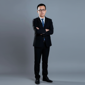 保留人物脸型、发型、年龄特征生成标准职场形象照,50MM焦段,F/4光圈(F/2.8-F/4区间),相机与人物距离3米,横向16:9比例(左右预留环境空间),人物占画面60%,入镜头部至膝盖上方5CM,平视视角,人物居中构图,头肩比例协调,身穿深墨蓝色西装,内搭白色衬衫,精致且高级的深蓝色斜向微微渐隐光泽感极细条纹商务感领带,下装黑色西裤搭配黑色皮带;正面抱胸姿态,肢体舒展的站立姿态,自信从容;主