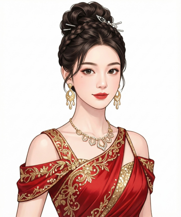 中国风二次元动漫风格,一位身着红色与金色渐变飘逸古风长裙的少女,长发如墨色瀑布般垂落,发间点缀着金色凤凰发饰,右手掌心托着一朵燃烧的金色莲花,莲花周围环绕着红色火焰光晕,左手自然舒展,裙摆与长发随风飘动,姿态轻盈灵动,面部表情温柔恬静,眼神清澈,整体线条流畅细腻,色彩鲜明且具有层次感,光影柔和,背景为纯白色,无其他元素干扰。