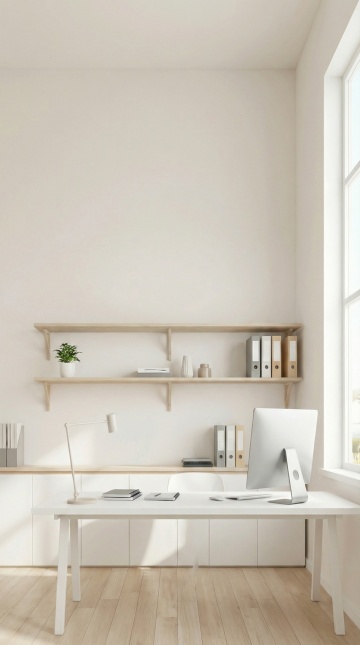 极简主义风格的不同场景布置书桌背景,温暖的原木色调(浅橡木色为主),柔和均匀的间接照明(桌面上方嵌入式灯带提供主要光源),3D渲染的光滑木质纹理,明亮通透的氛围,简约现代的书桌设计(与墙面嵌入式书架一体化),配套的浅米色布艺办公椅(金属细腿),书桌上配备极简设计的黄铜色台灯、黑色屏幕的电脑主机,书架上整齐排列着不同颜色的书籍、文件夹、黑色陶瓷花瓶和白色收纳盒,整体构图采用对称美学,景深控制得当,光线营造出宁静舒适的居家办公或学习环境,不同场景可包括:一侧增加绿植点缀的书桌、桌面摆放笔记本和咖啡杯的阅读角落书桌、书架上陈列更多装饰摆件的个性化书桌、带有小型打印机或扫描仪的功能性书桌等,保持统一的原木色调和极简设计语言,确保各场景下的光影质感和材质表现与原图高度一致。