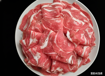 一盘新鲜的生牛肉片,牛肉片被精心卷成玫瑰花造型,摆放在黑色的圆形盘子中,牛肉呈现出鲜艳的红色,纹理清晰可见,肉质鲜嫩,盘子边缘点缀着几片绿色的香菜叶,整体画面简洁干净,背景为纯白色,突出牛肉的新鲜和质感,光线明亮柔和,从上方均匀照射下来,使牛肉的色泽更加鲜亮,阴影细节自然,展现出食材的原汁原味和精致的摆盘艺术。