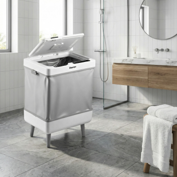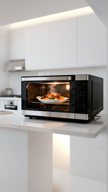 现代感与科技感交融的厨房场景,金属风电饭煲置于大理石台面,搭配清新果蔬与轻拟物设计,营造简约主义下的清爽舒适氛围。