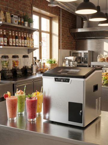 帮我把这个制冰碎冰一体机放到欧美商用沙冰店厨房场景中,旁边放着几杯做好的冰饮,刨冰,图片比例3:4,机器与场景融合,高清明亮风格,图中中不要出现其他机器