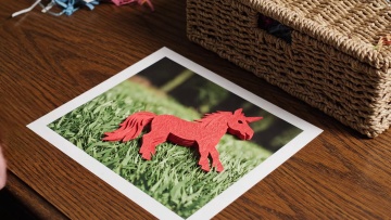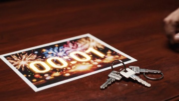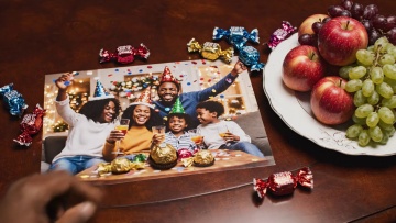 一段超写实的超现实主义视频,桌面上平铺着一张生动的跨年朋友圈九宫格照片,旁边摆着收纳盒。一只真实的人手入画,神奇地伸进了真实的动态照片场景内部,仿佛照片是一个窗口。手在照片中拿出其中一张宫格照片。手将截图放进收纳盒里。