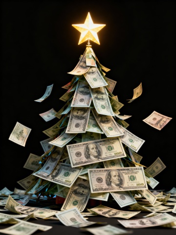 3D重拟物风格圣诞树由百元美钞堆叠而成,金属质感星顶闪耀,拼贴式货币飞舞,奢华与商务气息交织,冲击力十足的节日视觉符号。