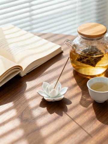 水墨山水屏风映衬青瓷茶杯,木雕托盘与干茶叶点缀,静谧质朴中透出古典中式韵味,实景质感十足。