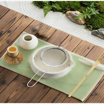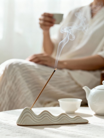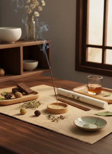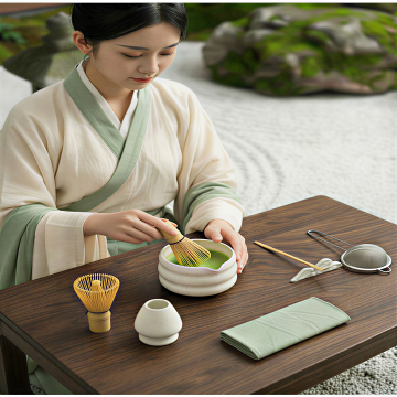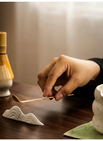 水墨山水屏风映衬青瓷茶杯,木雕托盘与干茶叶点缀,静谧质朴中透出古典中式韵味,实景质感十足。