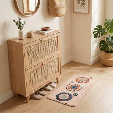 现代简约风边柜,融合性冷淡与轻拟物设计,弧形玻璃门与柔和配色营造温馨舒适感,搭配抽象画作与自然元素,展现文艺氛围。