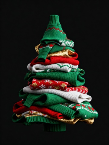 圣诞毛衣堆叠成树,融合面料风与拟人化设计,波普艺术色彩碰撞,营造喜庆温馨的节日氛围。