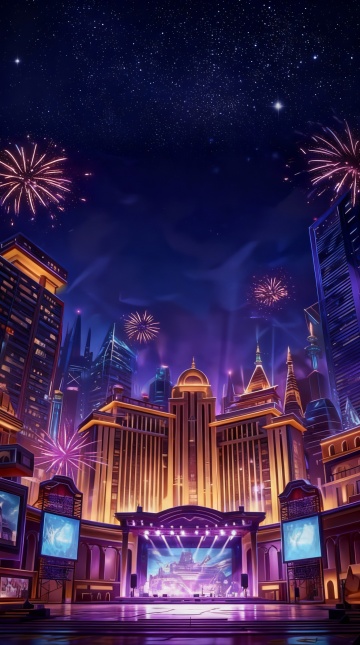 赛博朋克风格城市夜景,雨后湿漉漉的街道反射着霓虹灯光,中央是一个巨大的圆形霓虹舞台,舞台边缘有紫色和粉色的霓虹灯条,街道两旁是高耸的未来主义建筑,建筑上布满了各种颜色的霓虹广告牌和显示屏,天空中有一些乌云,整体色调以紫色、粉色和蓝色为主,营造出神秘而充满科技感的氛围,没有文字、LOGO、电话地址及二维码。
