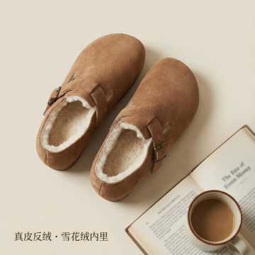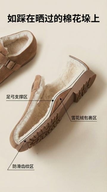 标题:「触碰肌肤的两种温柔」 左图:牛反绒特写 + 文案「透气牛皮,经时光打磨愈显质感」 右图:雪花绒内里特写 + 文案「仿若初雪落进鞋履的温软」