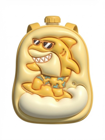 软3D风卡通背包,萌趣鲨鱼戴墨镜冲浪,塑料质感浮雕设计,夏日趣味感十足。