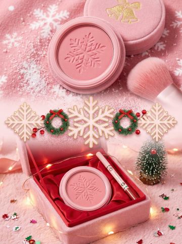 上宫格:大特写镜头,圣诞限定定妆散粉特写,粉盒是金色金属材质,表面印着雪花压纹,粉扑是白色毛绒材质,边缘缝着红色小丝带,散粉放在缀有圣诞铃铛刺绣的黑色丝绒垫上,丝绒垫上沾着少量细碎的人造雪,旁边摆着一支迷你化妆刷。中间衔接元素:大面积雪花图标层叠交织,雪花边缘鎏金描边,中间点缀迷你圣诞球与松枝图案,雪花间隙飘着细碎的银色亮片,将上下画面柔和衔接,营造出圣诞彩妆的高级氛围感。下宫格:中景镜头,圣诞散粉摆放在黑色亚克力化妆收纳架上,架身缠绕着冷白小串灯,旁边摆着一个迷你圣诞树摆件,收纳架放在深色梳妆台上,台面铺着黑色丝绒桌垫,桌垫上散落着少量金色亮片。