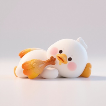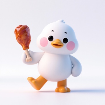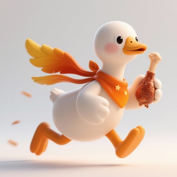 元气Q版卤鹅:橙黄渐变羽毛,举卤鹅腿比耶,动态线条配星星眼,适合零食包装年轻化