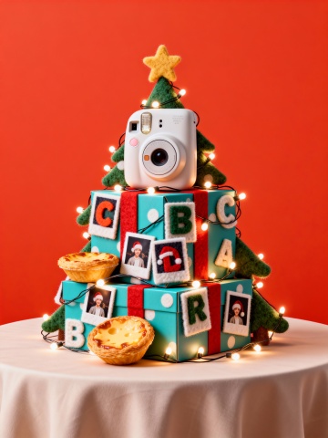 这是一款可以定制的一次性胶片相机,换个背景图,但是不要纯色,要简约的款式,相机的款式不要变,相机挨着外包装盒,类似于在公司送礼,年会的背景图,把相机放在桌子上,画面要协调,视觉中心是相机,虚化背景,主次要分明,要第一眼就看到相机,把相机整体都呈现出来,外包装盒也要全部露出来