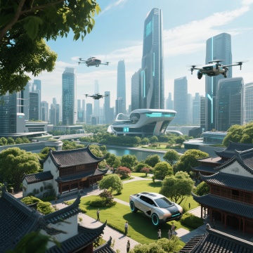 现代简约风格的办公背景,3D渲染效果,以明亮通透的蓝色天空和飘动的白色云彩为背景,前景是鳞次栉比的现代化摩天大楼群,建筑外立面以玻璃幕墙为主,反射着阳光呈现出金属质感的光泽,整体色调清新明快,光影效果自然柔和,展现出繁华都市的商务办公氛围,构图采用开阔的城市全景视角,营造出专业、高效、现代的办公环境意境。