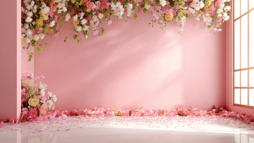 帮我生成图片:生成一个房间里的粉色墙壁,欧美风格,墙壁正对着镜头,下面的地板是白色的,比例 「16:9」一次性生成四张,光线明亮,不要太空旷,地上有一张地毯,地毯上散落着一些亮片和花瓣,墙壁下面都是鲜花鲜花,不要有空间感,只有一面墙壁,电商可用背景图