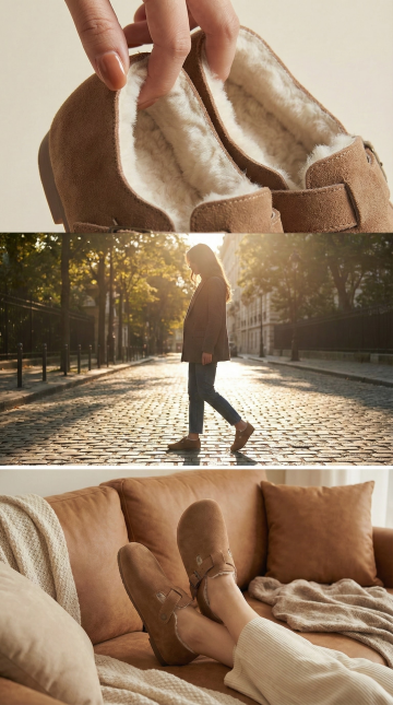 女模特坐姿侧影(只拍膝以下部分): 穿着卡其色棉麻裤+深灰羊毛袜 左脚穿鞋轻搭在书本堆上 右脚光脚踩在编织地毯边缘 环境: 书架局部虚化背景
