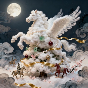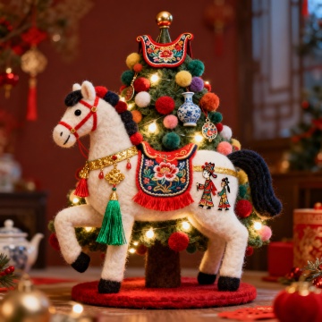 tree's body, while its hooves rest on auspicious clouds. Traditional Chinese knot ornaments hang from branches,