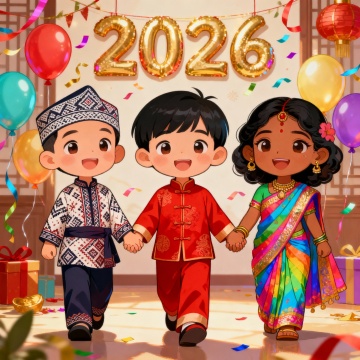 插画,苗族卡通小女孩,6个,浅蓝色背景