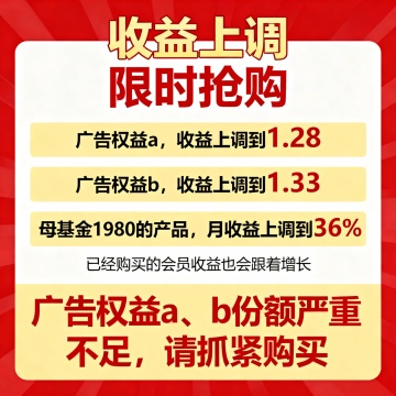 广告权益a,收益上调到1.28 广告权益b,收益上调到1.33 母基金1980的产品,月收益上调到36% 已经购买的会员收益也会跟着增长,另外广告权益a,广告权益b份额已经严重不足,请广大会员抓紧购买。