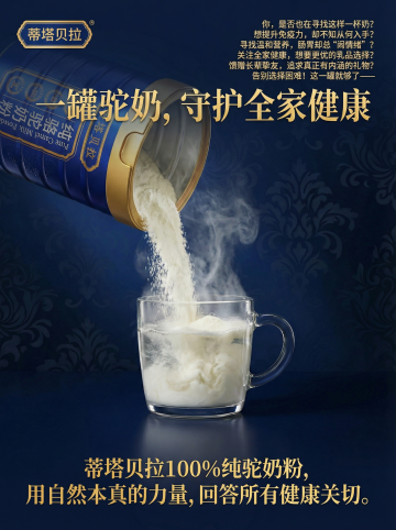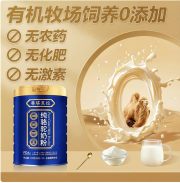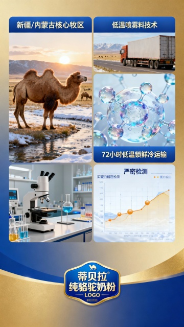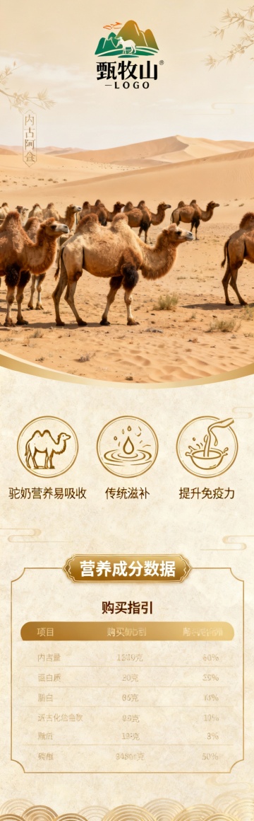 这不仅仅是一罐奶粉,这是一份来自广袤戈壁与无垠沙漠的生命赠礼。我们遵循自然的法则,呈现给您100%纯正的驼乳精华——无任何添加,不掺一粒杂粉,只为让您品尝到骆驼乳汁最本真、最珍贵的营养力量。设计高级一点