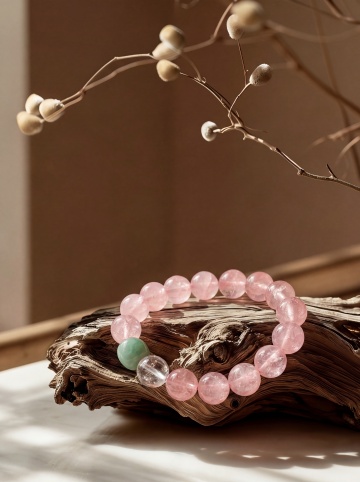 柔和光影中,粉晶手串静卧于木雕纹理之上,搭配干枝与石刻质感,营造出质朴文艺的中式静谧之美,传递舒适优雅的自然意境。