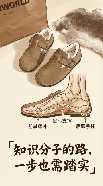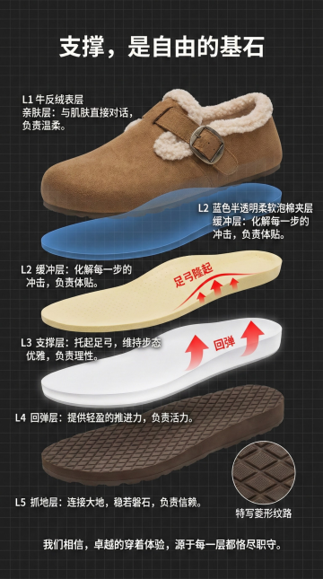 工艺与结构 布局: 用线条拆解图或爆炸图的形式,简洁示意鞋子的工艺:如乳胶底、符合足弓的承托设计、包边细节等。 文案标题: 「 隐于形的支撑,贴于足的关怀 」。