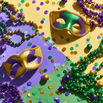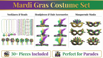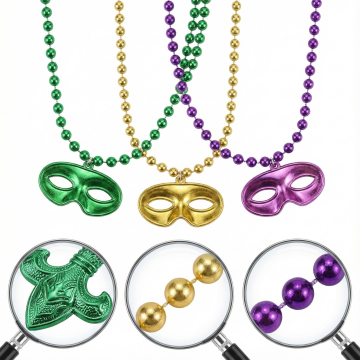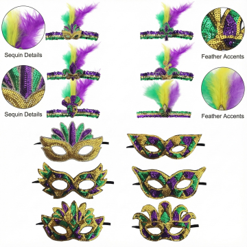 生成图片中配饰的多人物穿戴场景图,图片中的配饰分别是项链、胸章、发带、面具。