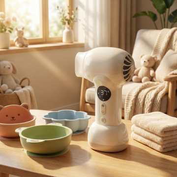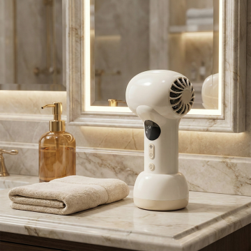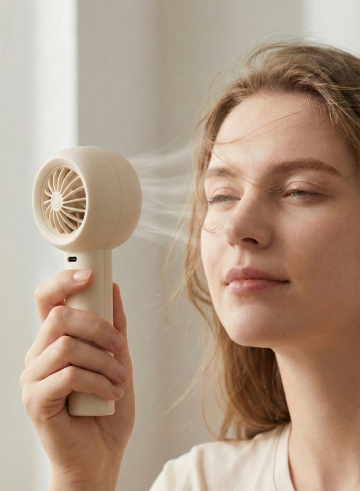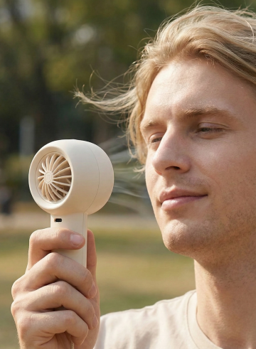粉色风扇置于绿草之上,简约现代设计,清新自然,尽显夏日凉爽。